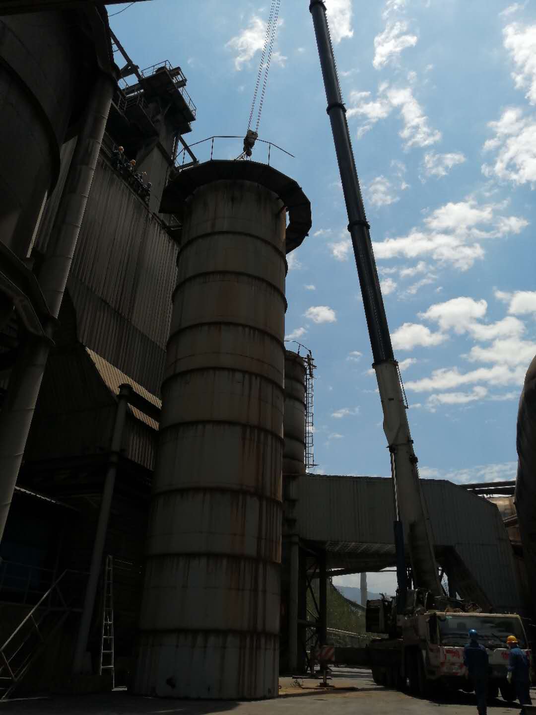 6月2日天氣晴朗,風(fēng)力1級(jí),具備良好的施工條件,7:30分130噸的吊車準(zhǔn)時(shí)到達(dá)拆除現(xiàn)場(chǎng),檢修班長(zhǎng)針對(duì)性的給班員講解具體的拆除工序,具體的安全措施、落實(shí)到個(gè)人、落實(shí)到互保對(duì)子。8:30分煙囪頂部的大蓋安全拆除,13:15分30噸重的第一節(jié)煙囪安全拆除,16:00分15噸重的第二節(jié)煙囪安全拆除。