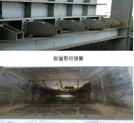 檢修班在接到任務(wù)后,立即對(duì)該問(wèn)題產(chǎn)生的根源進(jìn)行梳理,對(duì)卸料應(yīng)力進(jìn)行計(jì)算和綜合分析,在確保徹底消除隱患、穩(wěn)定可靠、簡(jiǎn)單易行和力爭(zhēng)最低成本的原則下研究可行性技改方案,決定采取四管齊下 :1.在每個(gè)石膏倉(cāng)與框架接觸部位均布增設(shè)剪切彈簧10個(gè)(使應(yīng)力緩釋)。2.將倉(cāng)內(nèi)錐段原不沾板改為不銹鋼板(滿焊)并直段噴涂鱗片樹脂(使石膏緩降,減小沖擊并消除腐蝕)。3.在真空泵出口增設(shè)減震膨脹節(jié)(隔斷設(shè)備運(yùn)行震動(dòng))。4.繼續(xù)對(duì)卸料空氣炮深挖潛能進(jìn)行技改(以致順暢下料)。