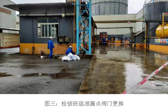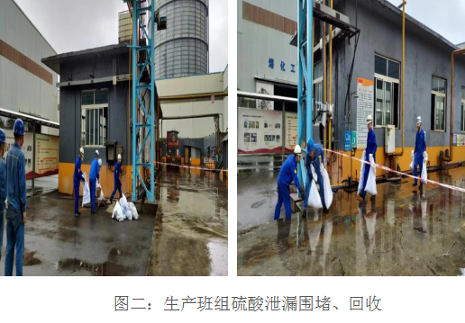 本次演練模擬硫酸卸車泵房硫酸管道泄漏,14:00當(dāng)班兩名酸堿工巡查酸堿管網(wǎng)時(shí)發(fā)現(xiàn)酸堿卸車區(qū)閥門滲漏;現(xiàn)場人員立即通知當(dāng)班班長,班長立即組織人員準(zhǔn)備急救物資;14:02當(dāng)班班長趕到現(xiàn)場查看滲漏情況后立即組織人員用應(yīng)急沙進(jìn)行圍堵并安排人員拉好警戒線維持好現(xiàn)場次序;14:03當(dāng)班班長將情況匯報(bào)調(diào)度室,同時(shí)通知檢修到場,調(diào)度室第一時(shí)間通知安全環(huán)?疲14:05檢修到現(xiàn)場確認(rèn)情況,制定出檢修方案并開始檢修,同時(shí)現(xiàn)場監(jiān)護(hù)人員確認(rèn)檢修防護(hù)用品是否穿戴完整;14:15經(jīng)過檢修搶修后現(xiàn)場試車確認(rèn),無滲漏,匯報(bào)相關(guān)領(lǐng)導(dǎo)同時(shí)把地面污染物進(jìn)行清理;14:25經(jīng)過相關(guān)領(lǐng)導(dǎo)確認(rèn)后,無滲漏,同意恢復(fù)生產(chǎn);14:28匯報(bào)調(diào)度,調(diào)度室通知恢復(fù)正常生產(chǎn)。